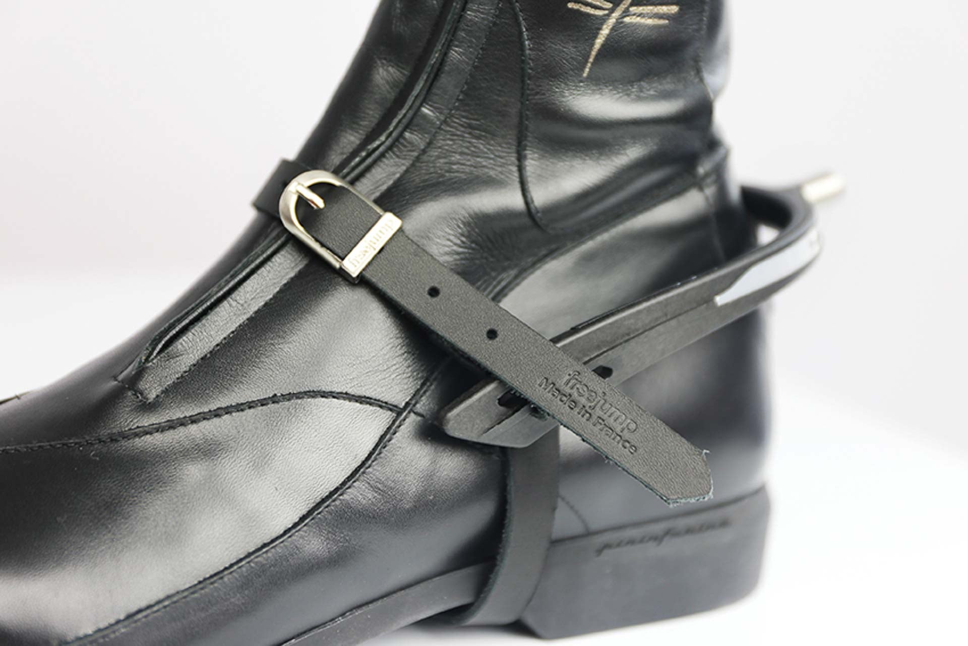 Der freejump Sporenriemen zeichnen sich durch innovatives Design aus: ein Gummizug entlastet den Fußspann von zu hohem Druck, selbst wenn die Sporen fest am Schuh sitzen. Universalriemen für alle Arten von Sporen.